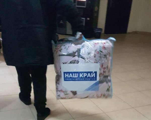 «Гречка отходит на второй план, ее пенсионер съест и может забыть имя кандидата. Поэтому выдают одеяла и подушки. Много «счастливых» людей по адресу Харьков, пр-т Юбилейный, 56 выходят вот с такими пакетами», — сообщили жители.