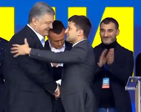 Президент Петр Порошенко поднялся на сцену кандидата в президенты Владимира Зеленского и обнялся с ним.