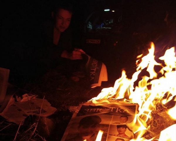 В Facebook Савченко опубликовала фото, на котором сжигает в костре агитационную газету со своим изображением.