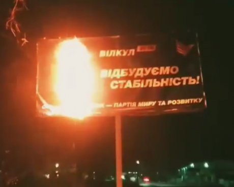 В городе Вишневе под Киевом неизвестные сожгли билборд кандидата в президенты, бывшего «регионала» Александра Вилкула. Видео опубликовали в группе «Национального корпуса» в Facebook.
