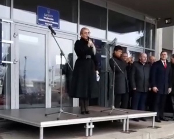Перед входом в горсовет Тимошенко поставили небольшую сцену. Она говорила в микрофон. Между тем у ступенек собрались люди, преимущественно пенсионеры. Из колонок, поставленных рядом с мэрией, играла песня группы «Океан Ельзи «Зелені очі».