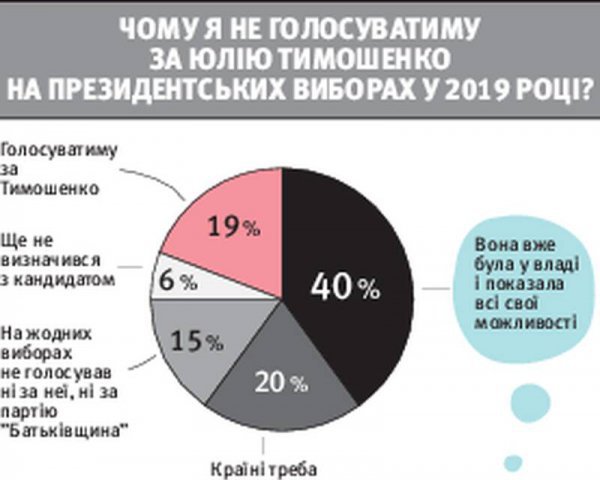 Комментирует опрос пользователей сайта Gazeta.ua. С 13 по 23 ноября они отвечали на вопрос: «Почему я не буду голосовать за Юлию Тимошенко на президентских выборах 2019 года?» Участие приняли 5609 человек. 19% будут голосовать за Тимошенко на президентских выборах. Почти 40% считают, что она уже была у власти и показала свои возможности. Еще 20% что стране нужен президент другого качества.