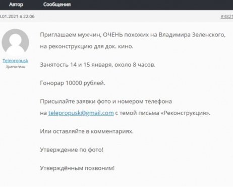 Формальный повод поиска двойников украинского президента — участие в сценах-реконструкциях для документального кино. За два дня съемок (8 часов работы) обещают 10000 рублей.