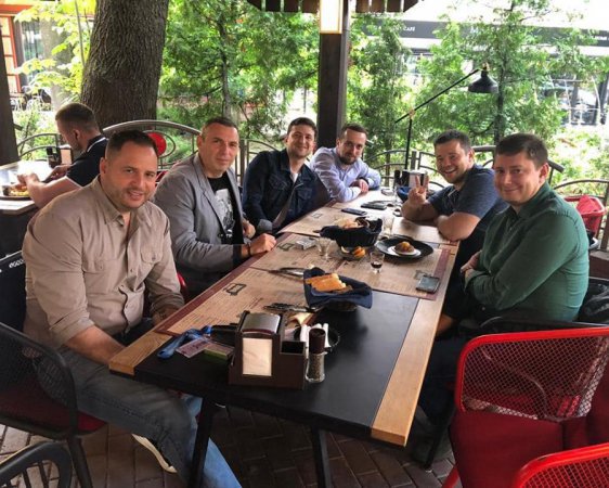 За столом с Зеленским сидят руководитель Офиса президента Андрей Богдан, заместители Богдана Кирилл Тимошенко и Юрий Костюк, а также помощники президента Андрей Ермак и Сергей Шефир.