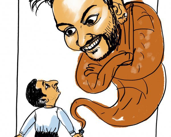 На другой карикатуре — «Алладин Александрович» с открытой бутылкой, с которой вылезает Киркоров. Рядом бутылки с надписями «Газманов», «Любэ», «Михалков», «Охлоб».
